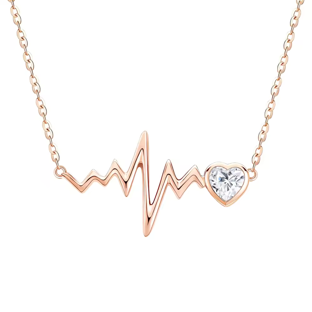 Eleva tu estilo con nuestro impresionante collar colgante de Oro Rosa 14K, que presenta un exclusivo diseño de electrocardiograma que captura bellamente el ritmo de la vida. Adornado con brillantes piedras de moissanita, esta exquisita pieza es perfecta para mujeres que aprecian la elegancia y la modernidad en su colección de joyas.