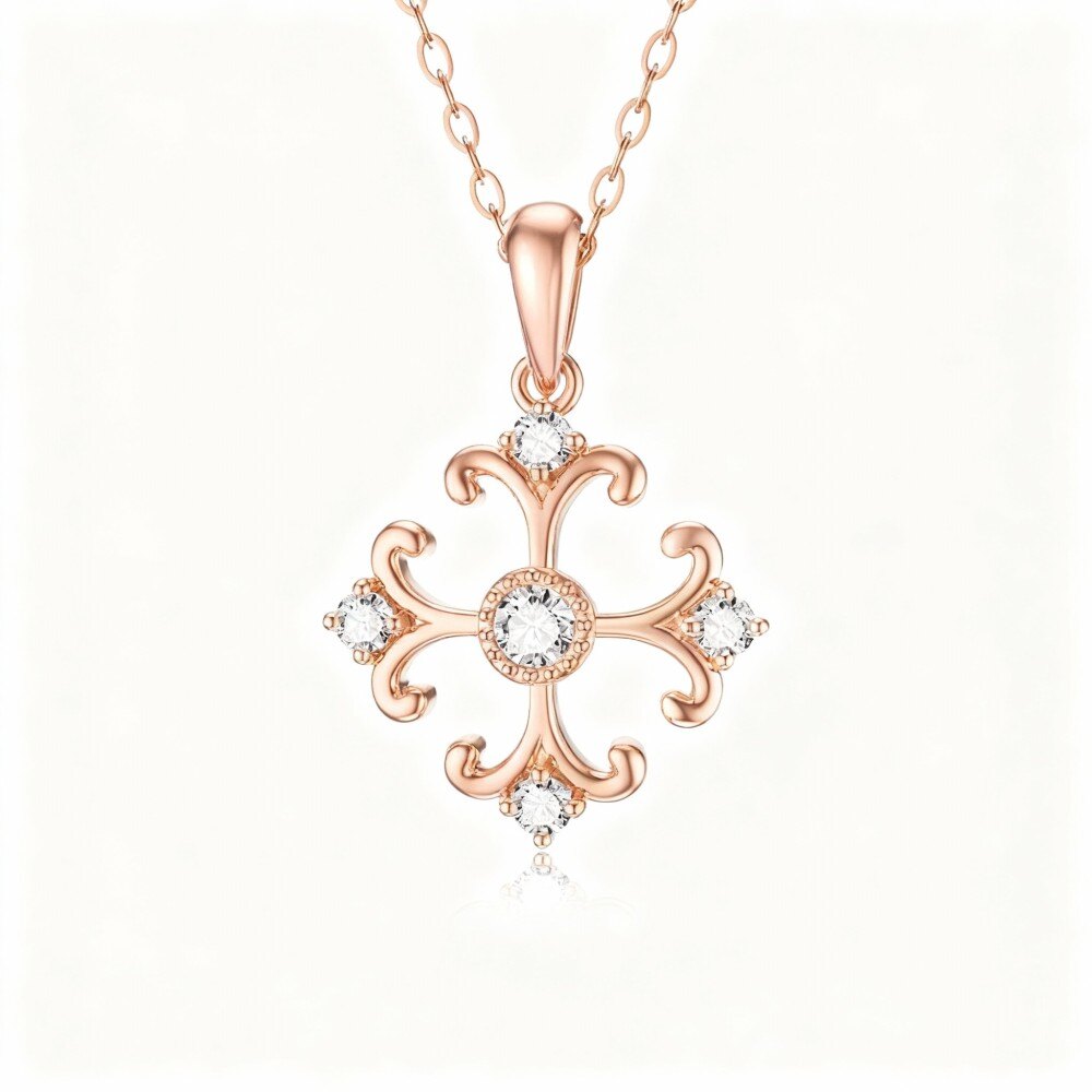 Descubre nuestro elegante collar con colgante de Oro Rosa de 10K, diseñado para mujeres, que presenta una impresionante cruz circular adornada con hermosas circonitas.