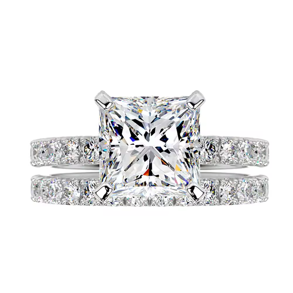 Nuestro juego de boda de oro blanco 10K con moissanite corte princesa redefine la elegancia para la novia moderna. Con una deslumbrante piedra central de moissanite disponible de 1 a 6 quilates, esta exquisita colección de anillos está elaborada magistralmente con una atención superior al