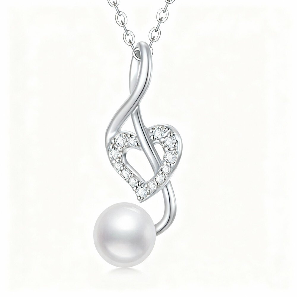 Descubre nuestro elegante collar colgante de Oro Blanco de 10K, que presenta una hermosa fusión de moissanite y perla en un diseño único con símbolo de corazón y música.