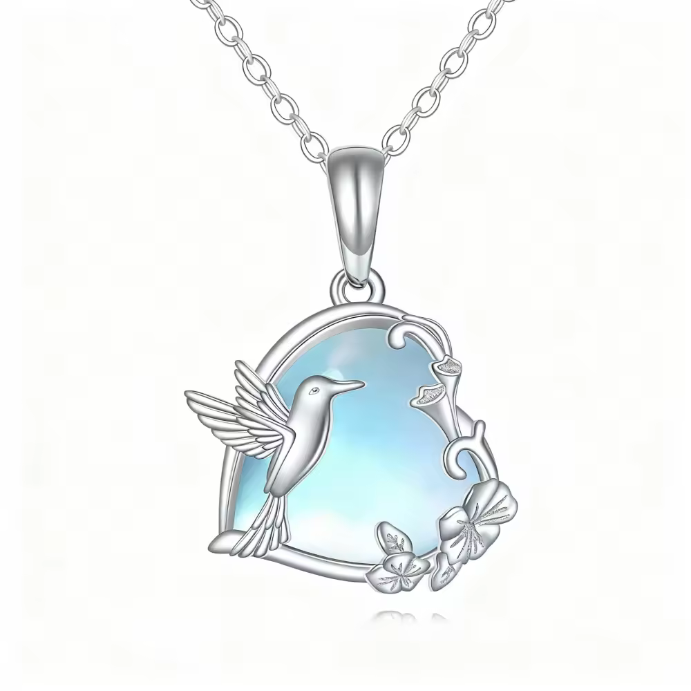 Descubre la belleza cautivadora de nuestro collar con colgante de Oro Blanco 10K, con un exquisito colibrí volando sobre un corazón radiante de piedra lunar. Esta pieza elegante combina artesanía sofisticada con profundo significado simbólico para mujeres exigentes.