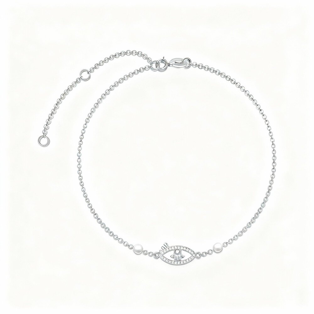 Descubra la elegancia de nuestra pulsera colgante de 10K De Oro Blanco que presenta un exclusivo dije de ojo del diablo con una perla, perfecto para mujeres que aprecian la belleza y la protección.