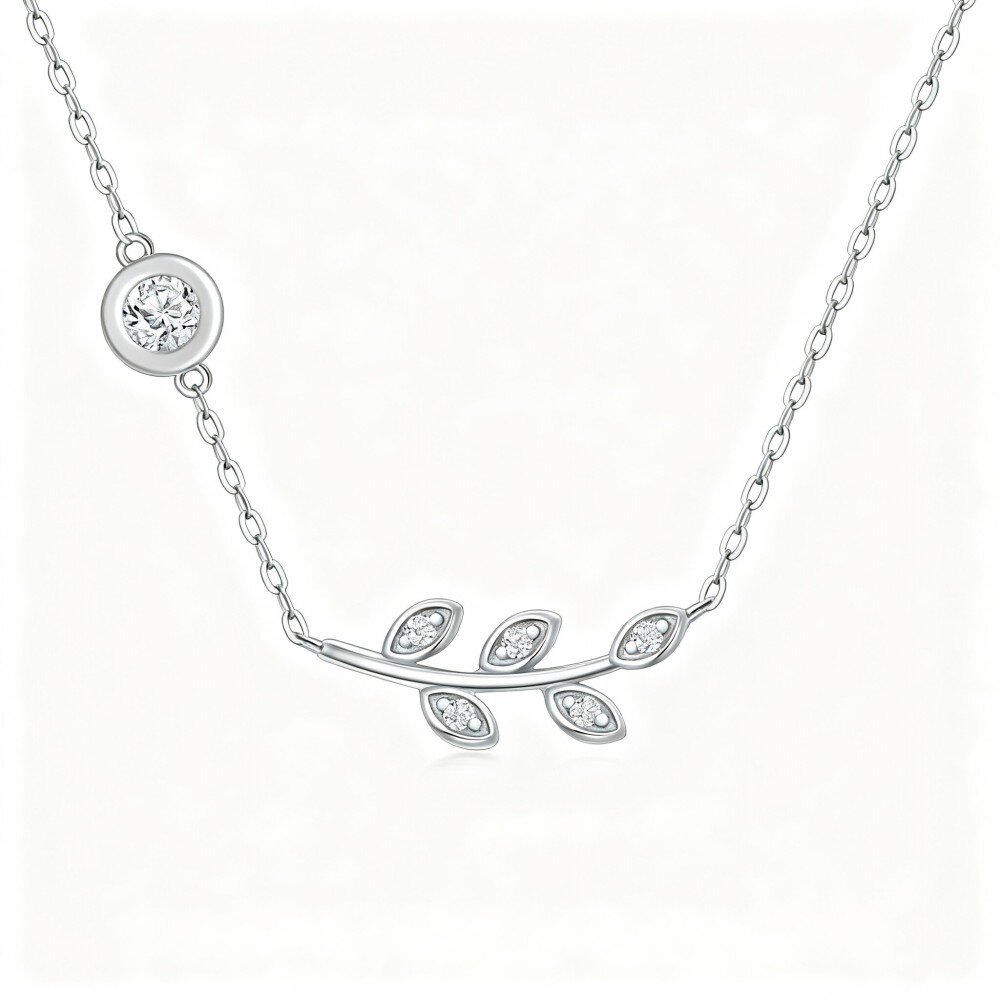 Eleva tu estilo con nuestro impresionante collar con colgante de Oro Blanco que presenta un diseño circular único adornado con hojas de circonio brillante.