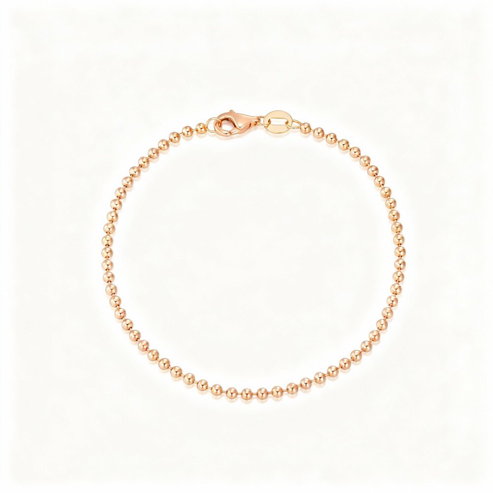Descubra el epítome de la elegancia con nuestra pulsera de cadena de cuentas de Oro Rosa de 14 quilates, elaborada con maestría para mujeres que aprecian las joyas sofisticadas y atemporales. Esta impresionante pieza, libre de la distracción de las piedras, resalta el encanto puro del Oro Rosa en un diseño minimalista pero lujoso que complementa cualquier conjunto a la perfección.