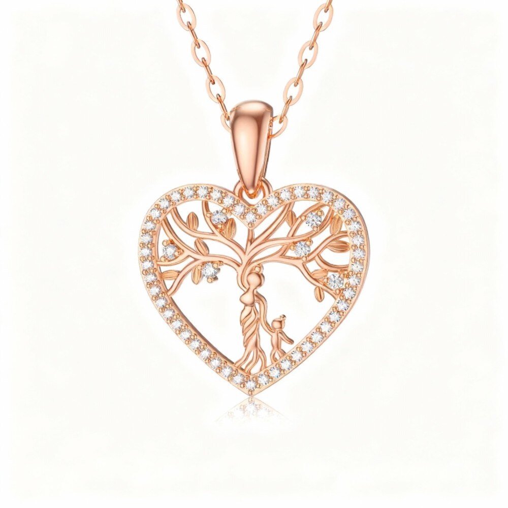 Nuestro exquisito collar colgante de Oro Rosa de 14 quilates incluye una brillante Moissanite engarzada en un precioso diseño del Árbol de la Vida, lo que lo convierte en el regalo perfecto para madres y mujeres que aprecian la elegancia atemporal y las joyas con significado.