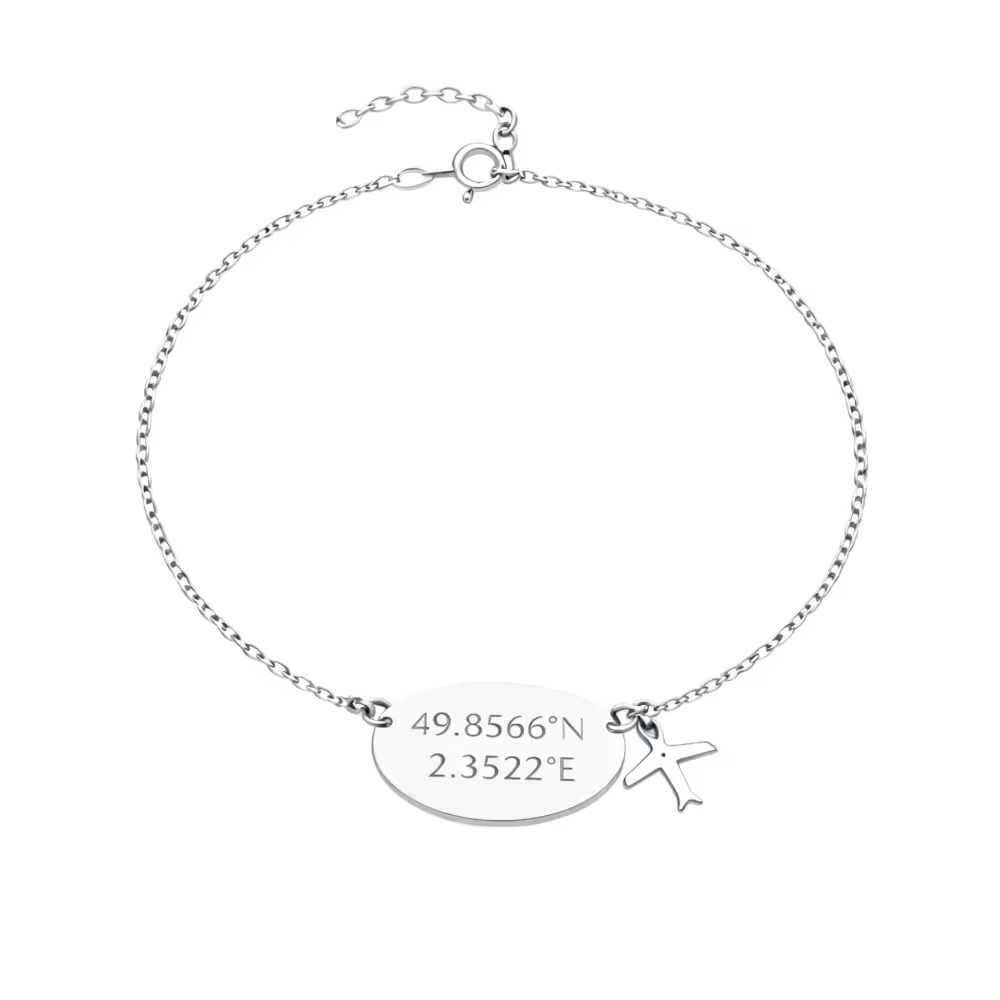Celebra tu travesía con nuestra pulsera charm de Oro Blanco de 10K, con grabado personalizado y un delicado charm de avión. Perfecta para mujeres aventureras que buscan expresar su estilo.