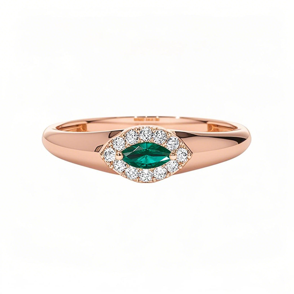 Realza tu historia de amor con nuestro exquisito anillo de compromiso de oro rosa de 18 quilates, que luce una impresionante esmeralda creada en laboratorio como pieza central, complementada con brillantes diamantes creados en laboratorio. Diseñado para la mujer moderna, este elegante anillo de halo presenta un pulido, corte y simetría excepcionales, irradiando un encanto lujoso que capta la atención y encarna el compromiso y el estilo.