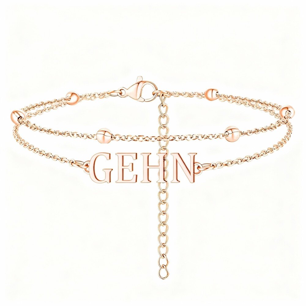 Nuestra lujosa tobillera de capas múltiples con charm en Oro Rosa de 18K encarna elegancia personalizada, con un diseño clásico de nombre para una declaración de joyería única.