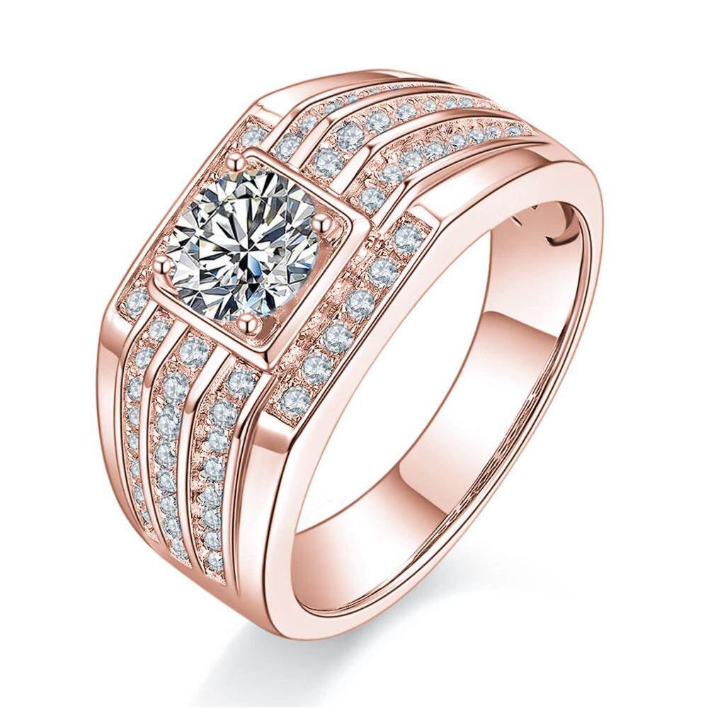 Eleva tu estilo con nuestra lujosa anilla masculina de oro rosa 18K, con una deslumbrante moissanita de corte redondo de 1 CT. Esta pieza sofisticada combina artesanía excepcional con diseño contemporáneo.
