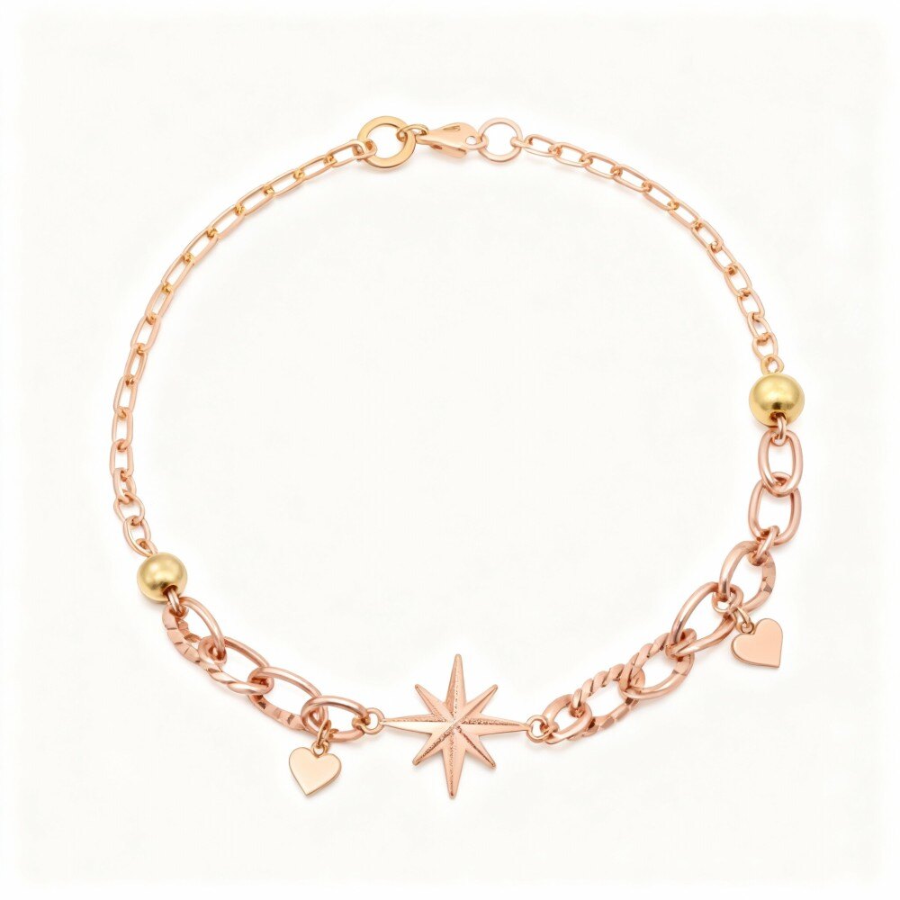 Meticulosamente elaborada en Oro Rosa de 18 quilates de primera calidad, nuestra pulsera colgante exhibe un delicado colgante de estrella que añade un toque de elegancia celestial a su vestuario. Su diseño minimalista garantiza que complemente cualquier atuendo, desde la ropa informal de día hasta el sofisticado atuendo de noche, lo que la convierte en un básico versátil en su colección de joyas. Ideal para mujeres que aprecian un estilo discreto pero impactante, esta pulsera promete durabilidad y un atractivo atemporal sin necesidad de piedras.