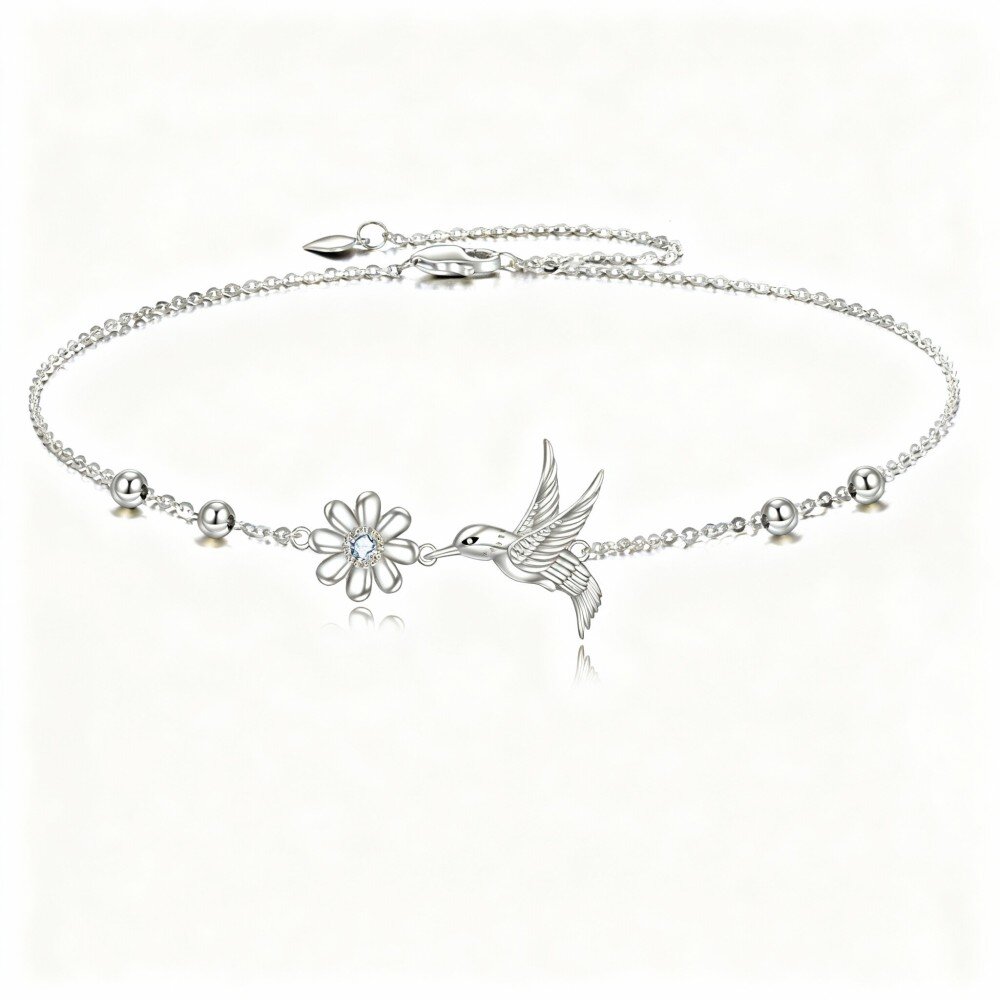 Eleve su estilo con nuestra exquisita pulsera colgante de Oro Blanco de 9 quilates, con deslumbrantes circonitas cúbicas, un delicado colibrí y encantadores motivos de cuentas de margaritas, diseñada exclusivamente para mujeres que aprecian la artesanía fina en la joyería de Oro Blanco.