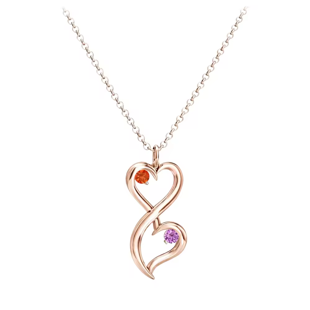 Fabricado en Oro Rosa de 10K de alta calidad, este exquisito colgante de collar presenta una fusión delicada de corazón y símbolos infinitos, acentuada por una piedra de nacimiento personalizable que añade un toque personal. Diseñado para mujeres que valoran joyas significativas,